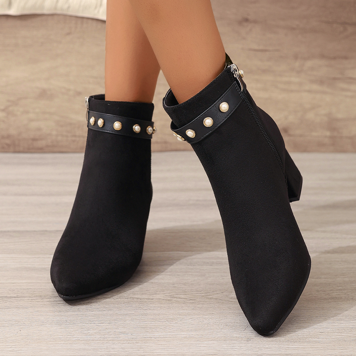 Bestselling Black Pearl Microfiber Women Ankle Boots Pointed Toe Chunky Heel Low Heel Height Increasing Women Boots Belt Low Tube Women Boots Save 85% Now [25fTphdW]
