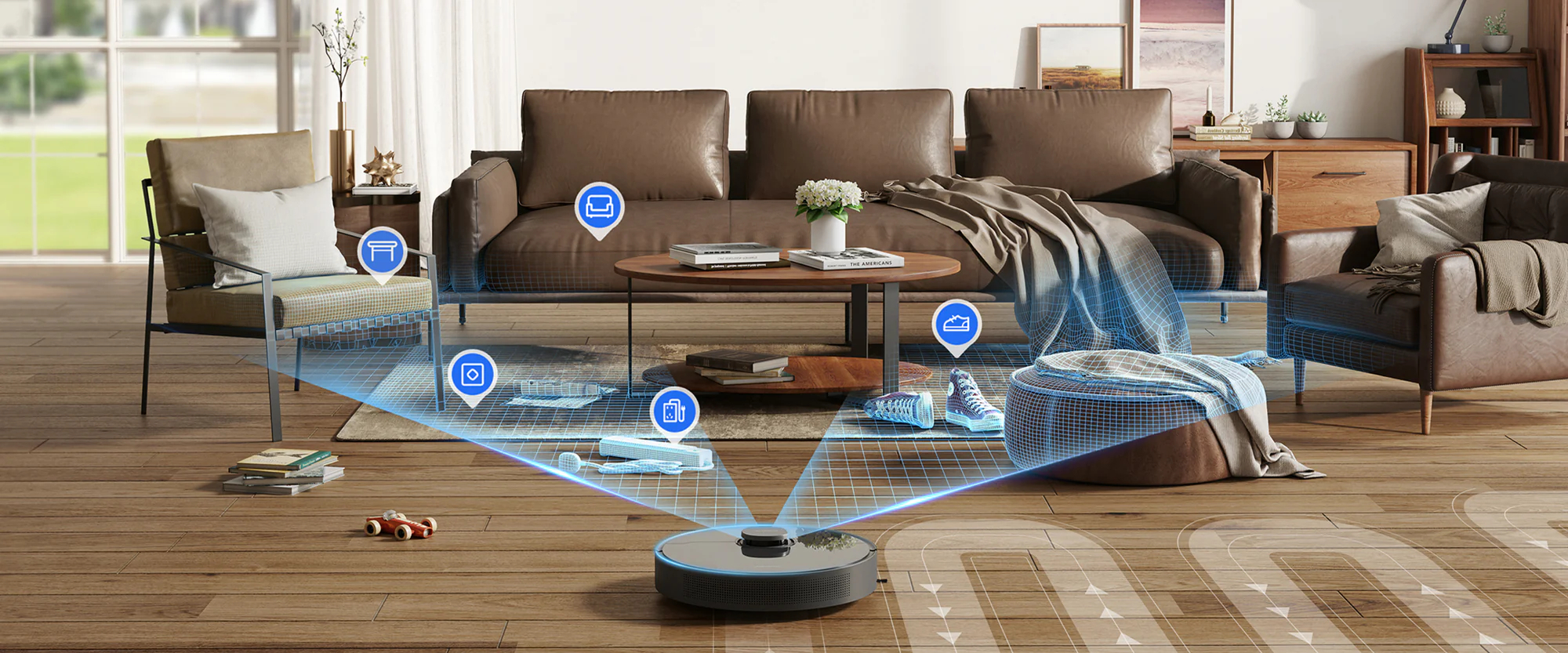 Z napredno umetno inteligenco (AI) in LDS izogibanjem oviram lahko čiščenje prepustite robotu. AI natančno prepozna in se izogne oviram, prepozna prostore za priporočanje čistilnih strategij ter hitro izdeluje zemljevide vašega doma, da zagotovi učinkovito in uspešno čiščenje, ki ne izpusti nobenega kotička.