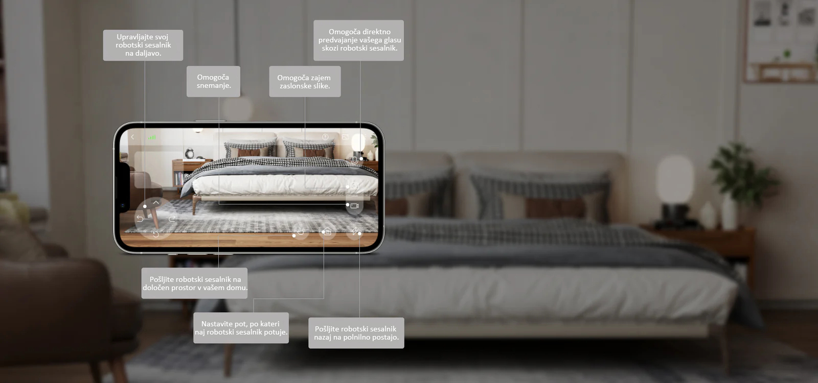 Oddaljeni video nadzor vam omogoča, da preverite svoj dom, svoje hišne ljubljenčke in svoje otroke, ne glede na to, kje ste. Pridobite pogled iz perspektive robota, da vidite svoj dom iz povsem novega kota, ali pa si oglejte prostore pod pohištvom z nekaj dotiki svojega telefona.