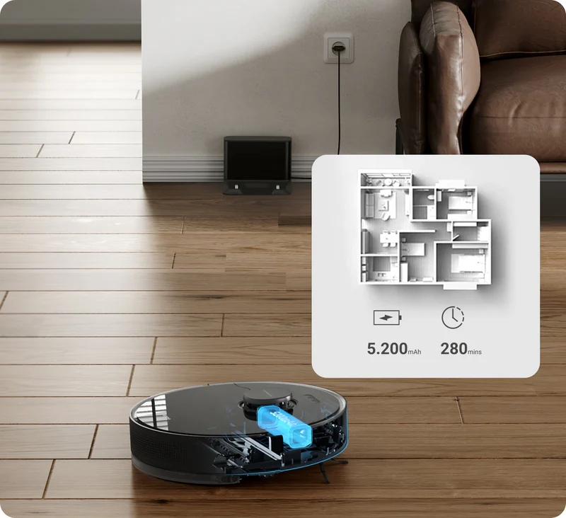 - Celovito čiščenje celotnega doma - Uživajte v čiščenju od kota do kota s 5.200 mAh baterijo, ki zagotavlja do 280 minut neprekinjenega čiščenja. Ko se baterija izprazni, se vaš robot samodejno vrne na polnjenje in nato nadaljuje s čiščenjem natanko tam, kjer je končal, da zagotovi čiščenje celotnega doma.