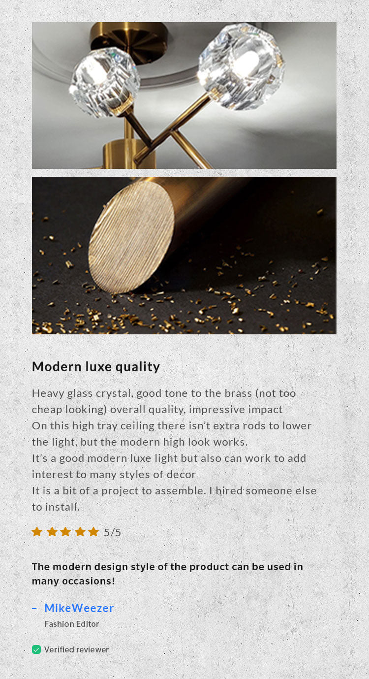 K9 Crystal and Solid Brass.Light Source: G9 bulbs (Not included), Max 40 Watts per bulb. Suitable for CFLs, Halogen and LED bulbs. Dimmer switch compatible. Suitable: Dining Room, Living Room, Kitchen, Etc.chartmove chart Specifications:Product Type