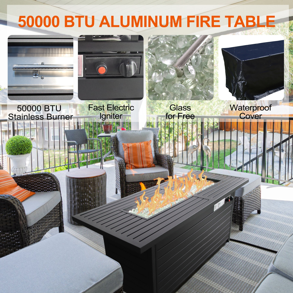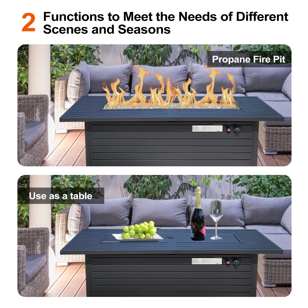 Versatile Functionality:1.Metal lid that is easy to pick up or put back.2.Premium fire glass & stainless steel burner.3.Separate lgnition control4.handle easy to open and closeFunctionality and Freebie :1.The 50,000BTU burner is made of stainless