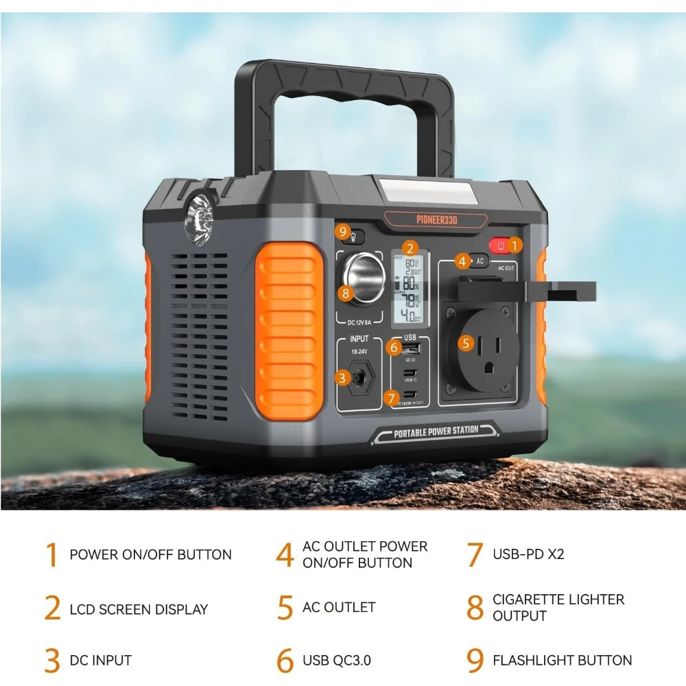 - ⚡ WHAT'S INCLUDED: 1x Pioneer 330W Portable Power Station, 1x 65W USB-C Adapter 1x USB-C Charge Cable, 1x User Manual. We provide excellent 24-hour customer service, a 1 year warranty, as well as a 30-day money back guarantee on all purchases!