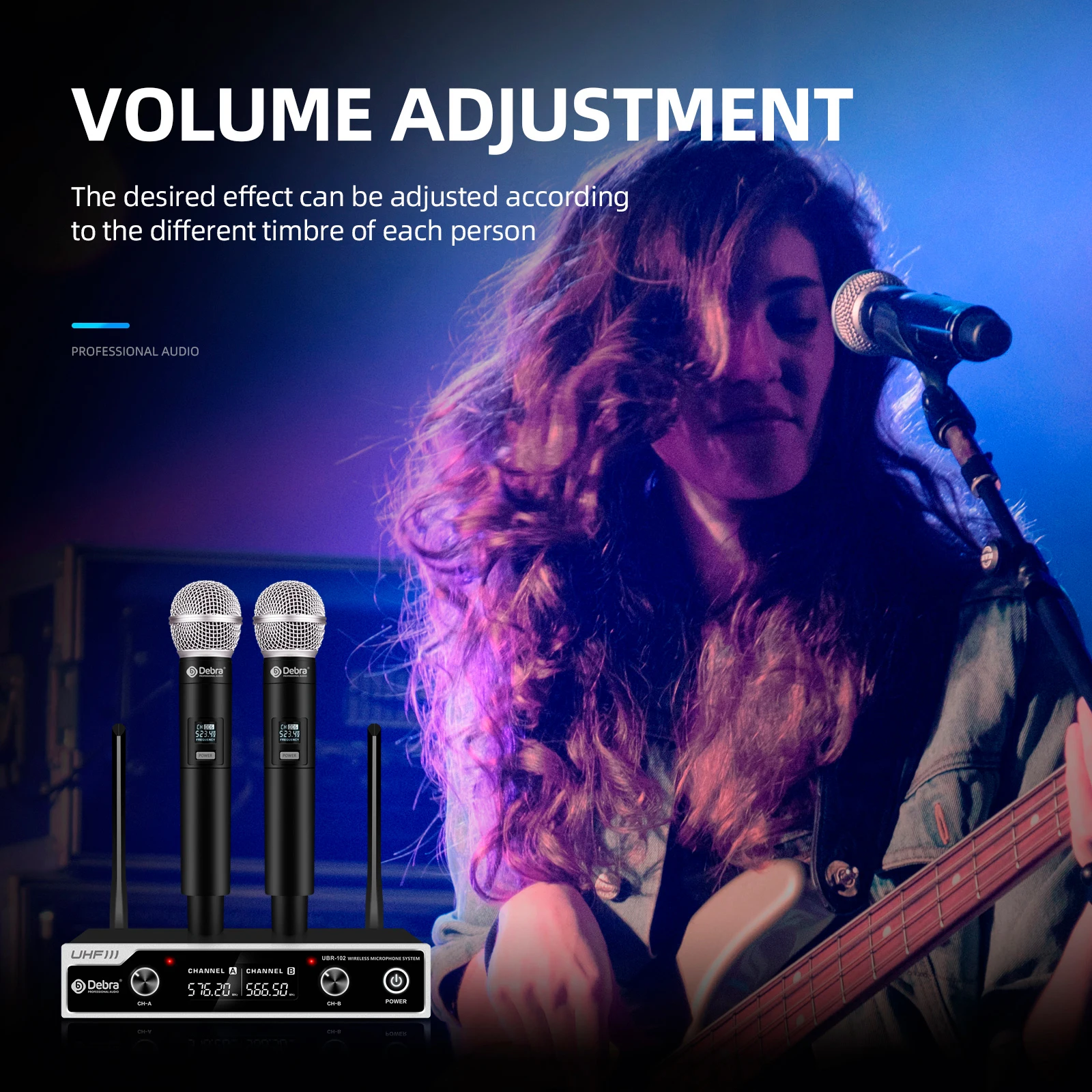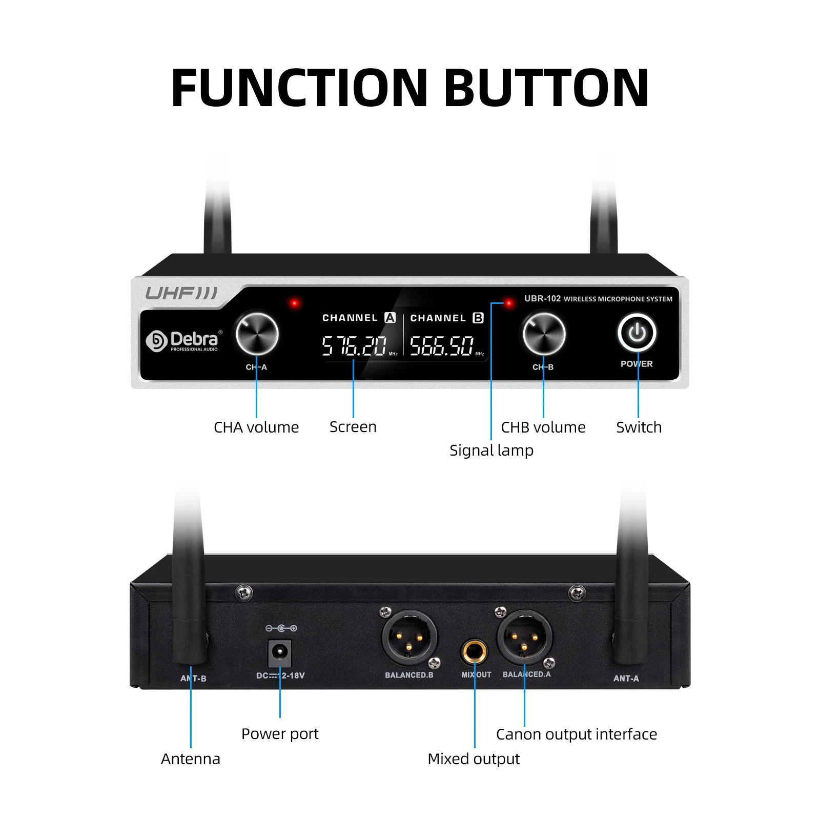 SPECIFICATIONSBrand Name: DebraCertification: CECommunication: WirelessDEBRA Model: UBR-102Diaphragm: S-MallHign-concerned Chemical: NoneOrigin: Mainland ChinaPackage: YesPolar Patterns: CardioidSet Type: Transmitter SetsStyle: Handheld MicrophoneTra