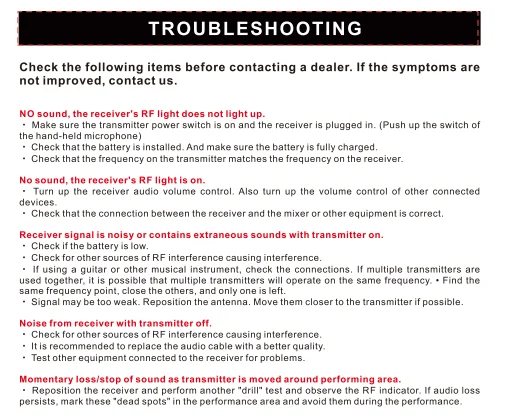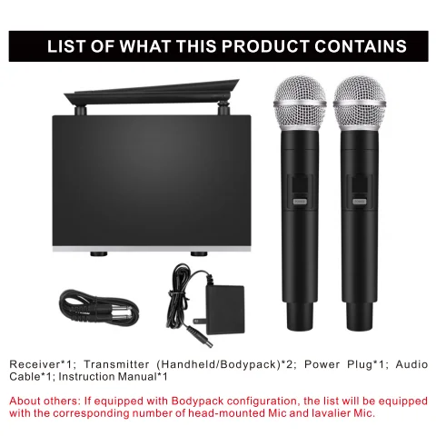 Provides clear, noise-free wireless transmission and excellent sound reproduction,Simple setup and installation will have you streaming clear sound in no time , System features include handheld and lavalier microphones, UHF high-frequency system , dual-frequency design, high signal-to-noise ratio performance and more ,Enjoy two-channel voice distribution across transmitters, whether it's for work or play, whether it's a vocal performance on stage or a speech in a conference room , this wireless microphone system will provide you with a premium audio experience , Take advantage of today's latest system technology and enjoy hassle-free, reliable wireless sound transmission with this all-in-one kit.it can be connected to power amplifiers, mixers,active speakers and other equipment. Suitable for small stage, church, meeting, party , karaoke