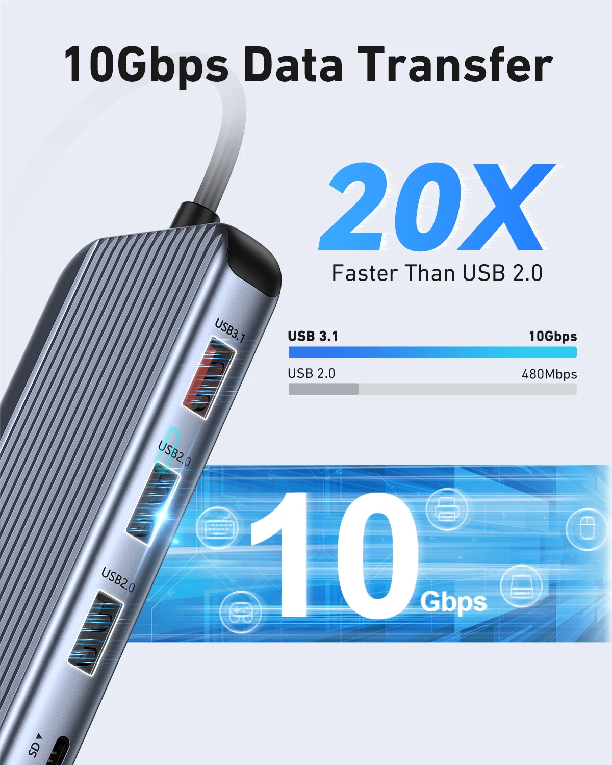 SD Card Reader: Max 104 MB/s(Read); Max 80MB/s(Write), (Note: Speed will be influenced by SD/TF card's limited.)