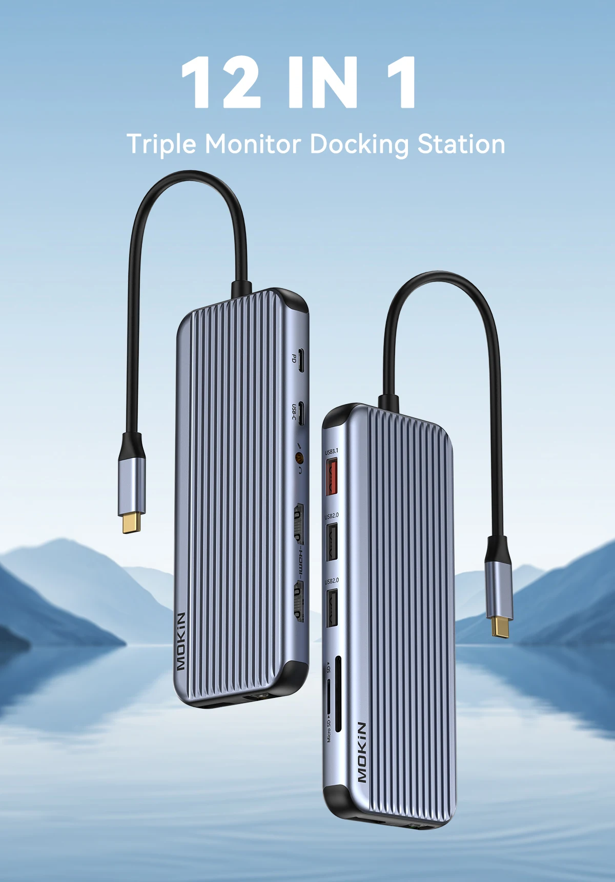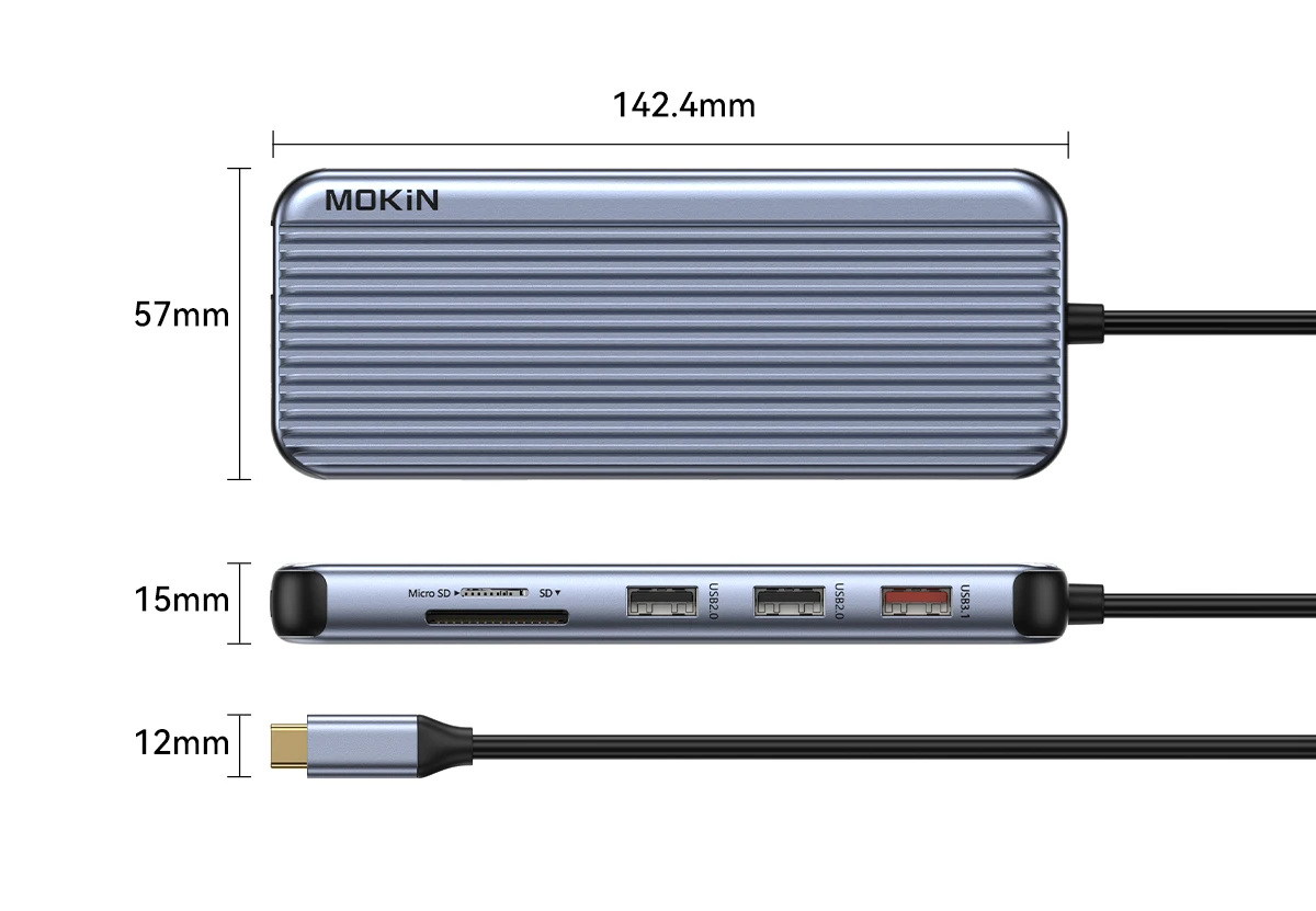 SPECIFICATIONSBrand Name: MOKiNCertification: CEChoice: yesFuntion: HDMI-Compatible/Card Reader/RJ45Hign-concerned Chemical: NoneInterface Type: USB 3.0Origin: Mainland ChinaPackage: YesPorts: 12,12Standard: USB 3.0semi_Choice: yesMOKiN 12 in 1 Docki