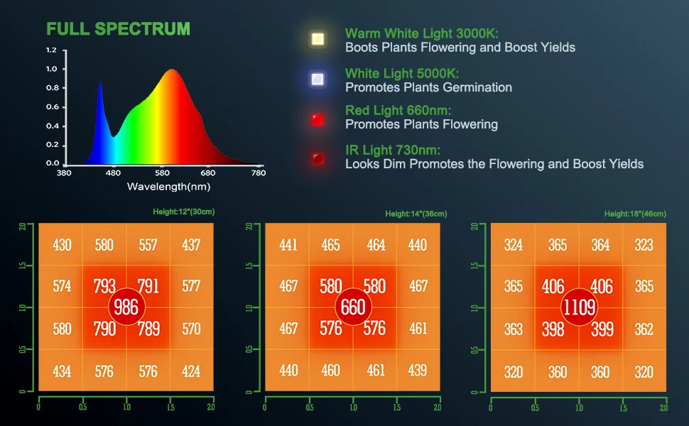 Spectrum: 660-665nm 730-740nm 3000-3200K 6000-6500K