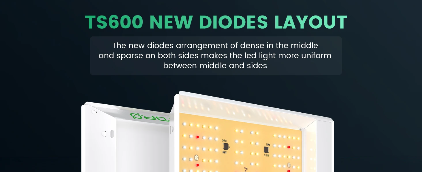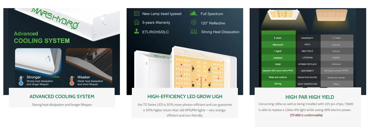 Full spectrum designed, provide nutrients for each stages of plants, one TS600 light is equal to a complex HPS grow system, change height to suit for different stage of plants, make indoor planting become more easier and more convenient