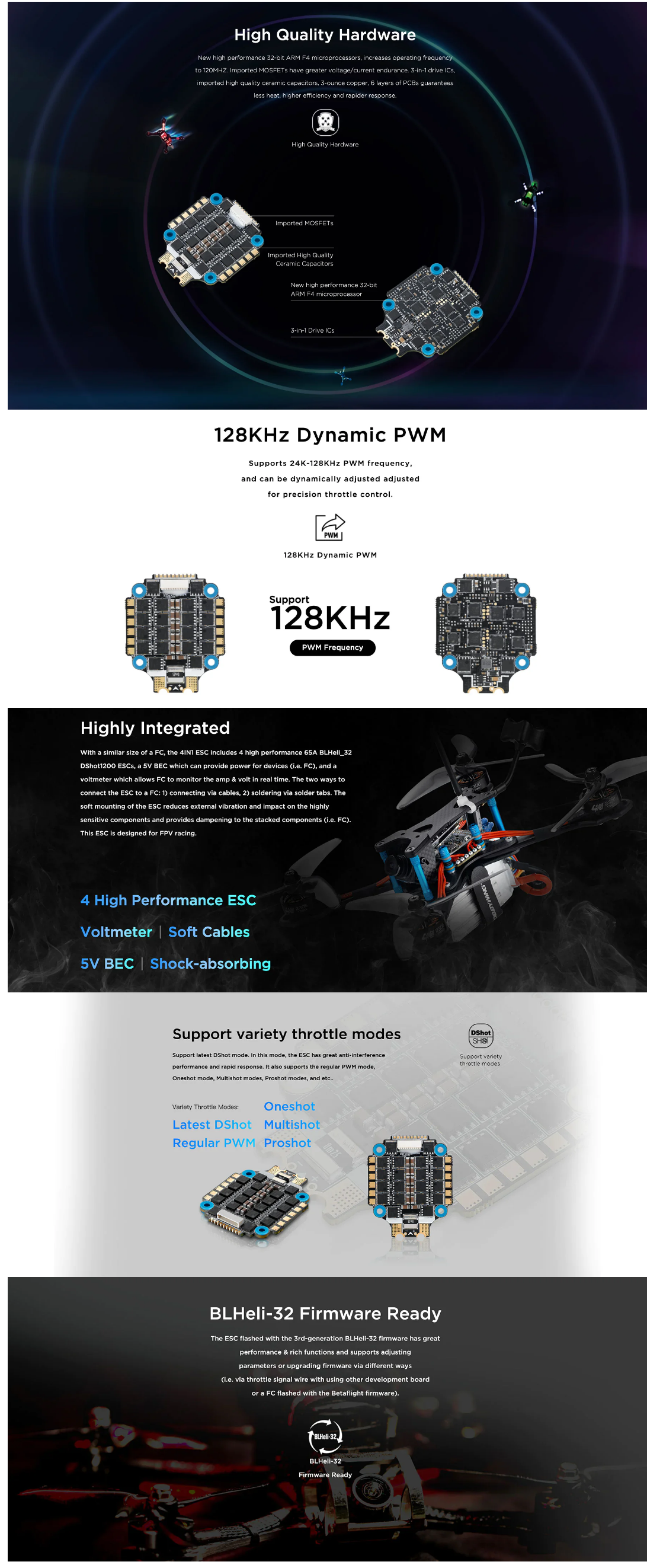 - The third generation BLHeli_32 code can support up to 128KHz PWM output frequency, which can be compatible with more motors.