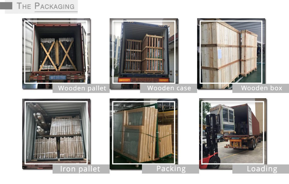 Step 1.Protective tape protects frames from scratches; Step 2.Keep windows or doors fixed on iron pallets; Step 3.Tie up windows or doors on the iron pallets with plastic belts; Step 4.PE films to keep away from sea water; Step 5.Fill in the space between each two iron pallets by air bags; Step 6.Tie up iron pallets in container with plastic belts. Our packages will ensure the windows and doors arrive at project jobsite in good condition.