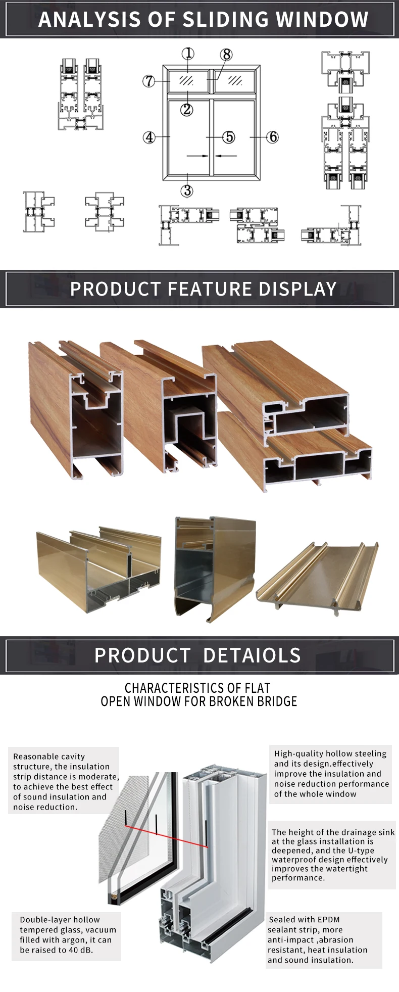 Product Description Product name: Aluminum sliding double glazed window place: patio,bathroom,balcony,bedroom, kitchen Material: tempered glass and Aluminum Alloy Types: Customized Size Colors: yellow,Red sandalwood,Gold,red,Grayish white,Sand gr