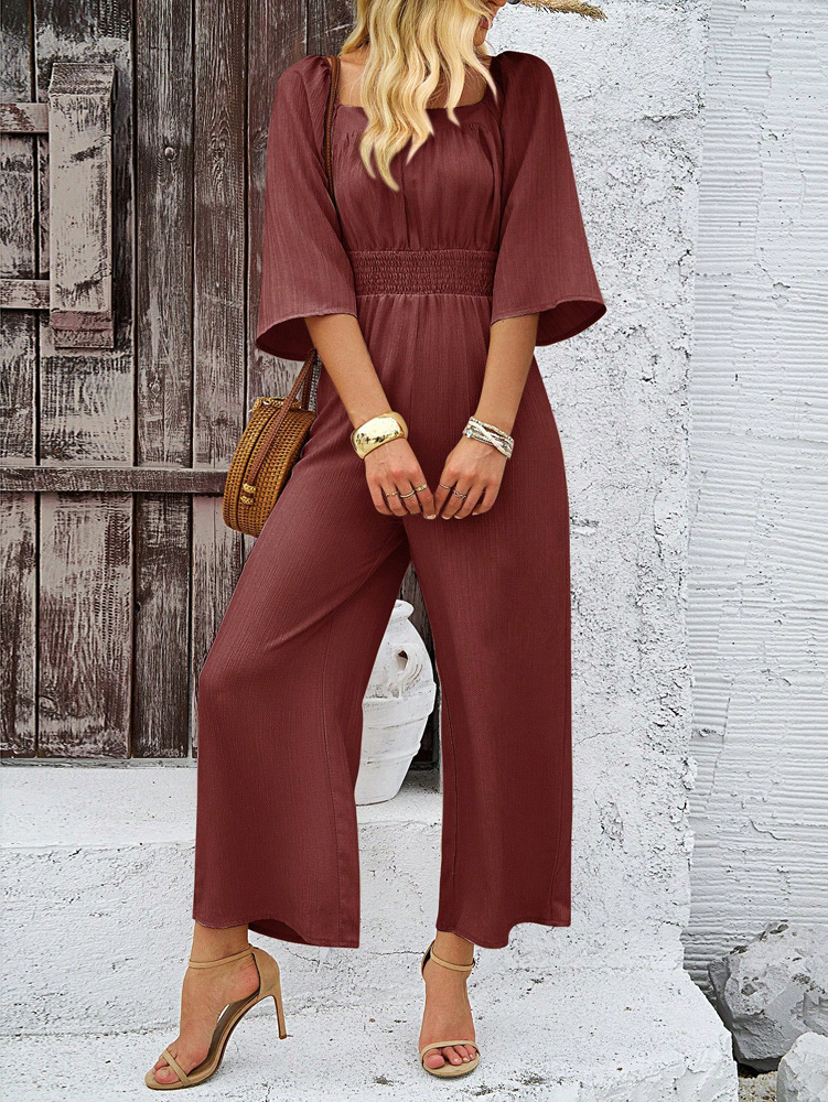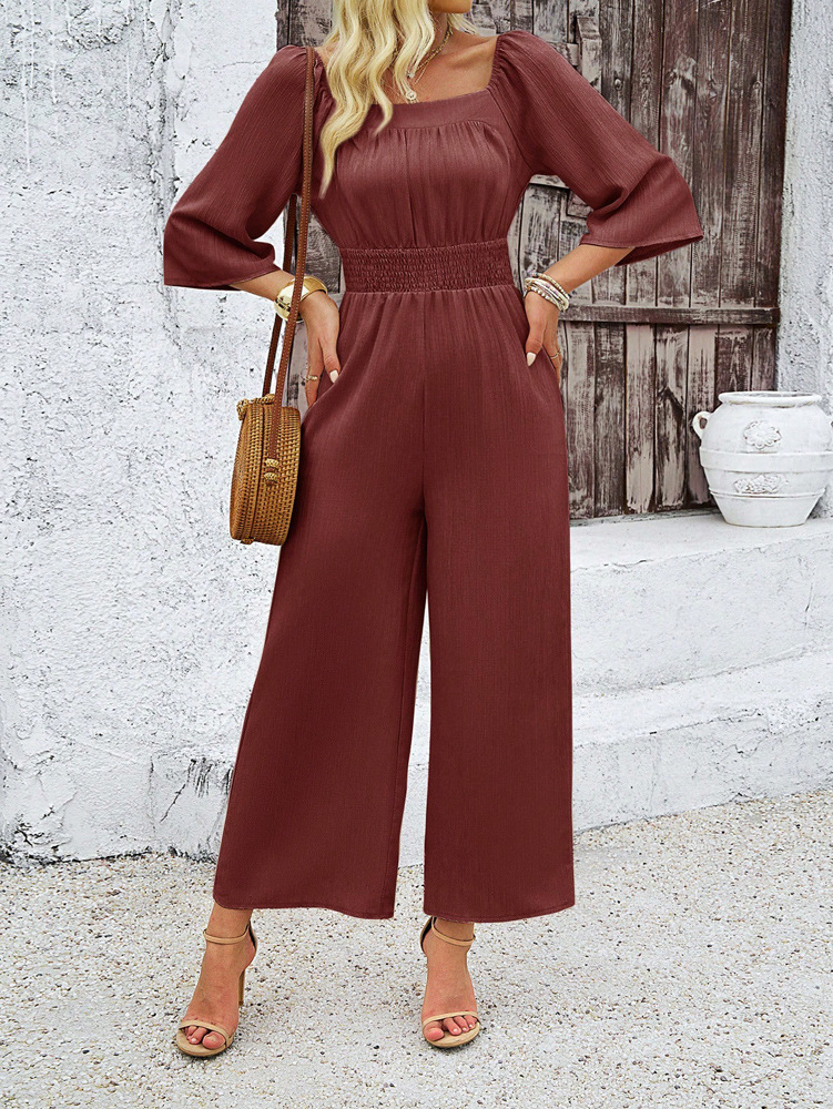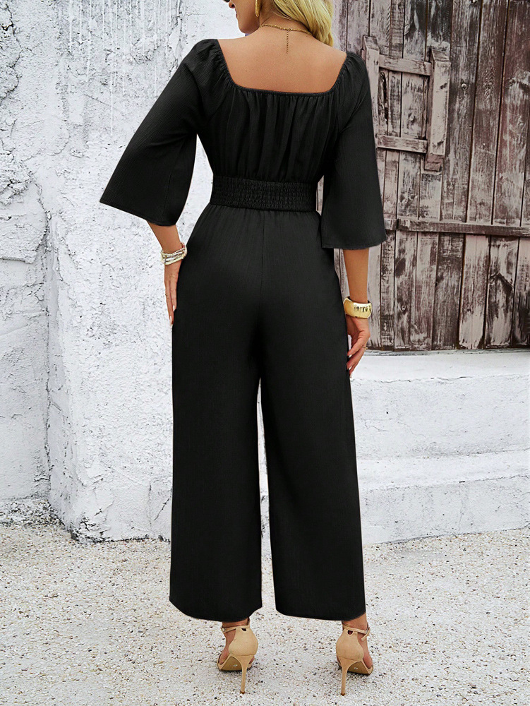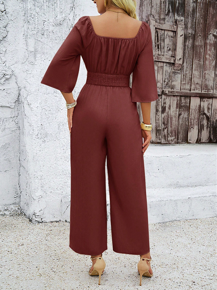 Style: ElegantFit: RegularFabric: PolyesterPattern: SolidElement: SmockedNeckline: Square NeckSleeve Type: RegularSleeve Length: 3/4 SleevePant Length: FullMain Composition: PolyesterSeason: Spring/Summer/FallF00264449