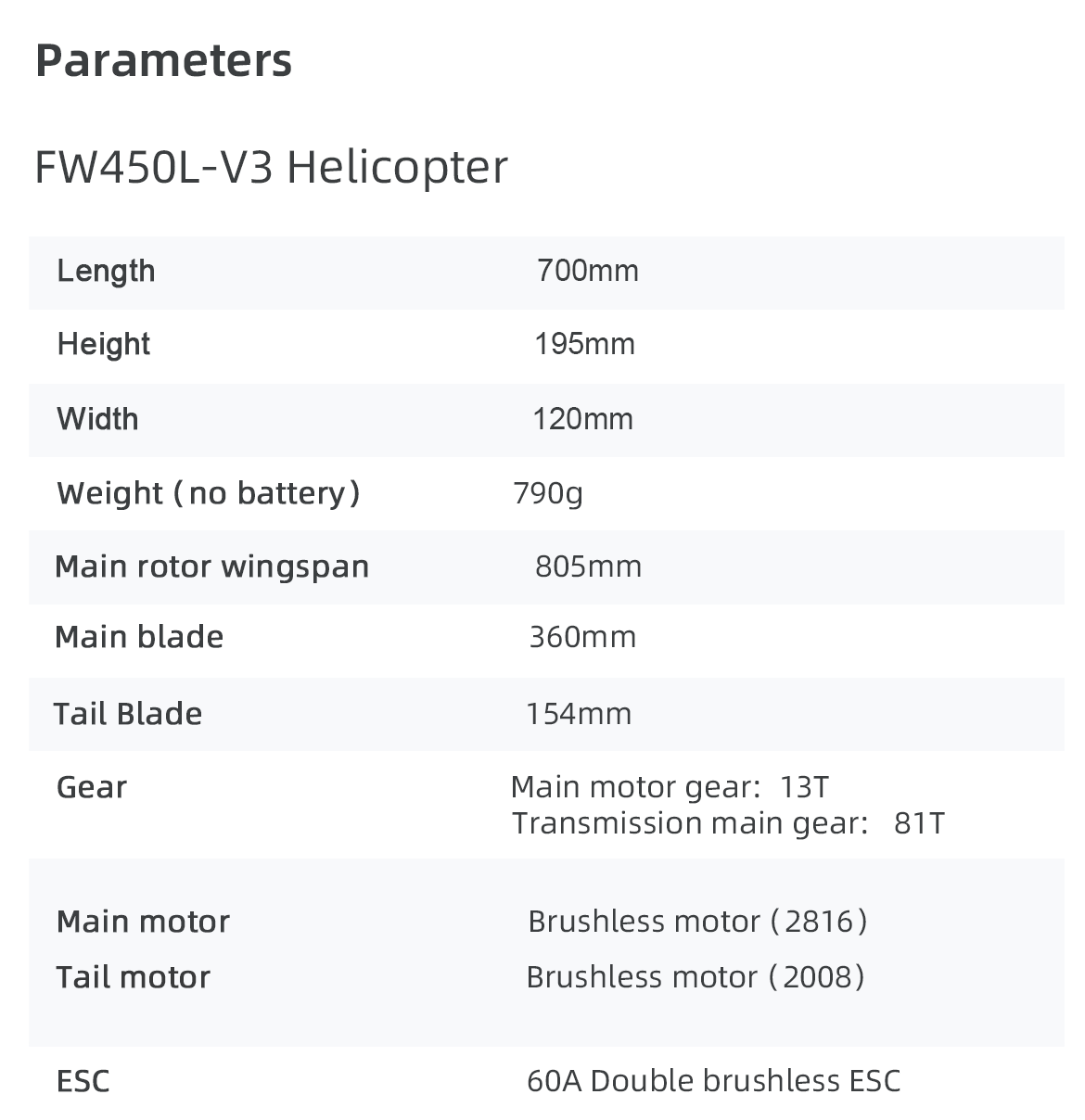 Package includes:1 x FW450L V3 Helicopter with H1 Flight Controller - White1 x Remote Controller1 x 4S 16.8V 5000mah Battery 1 x Lipo Battery Charger