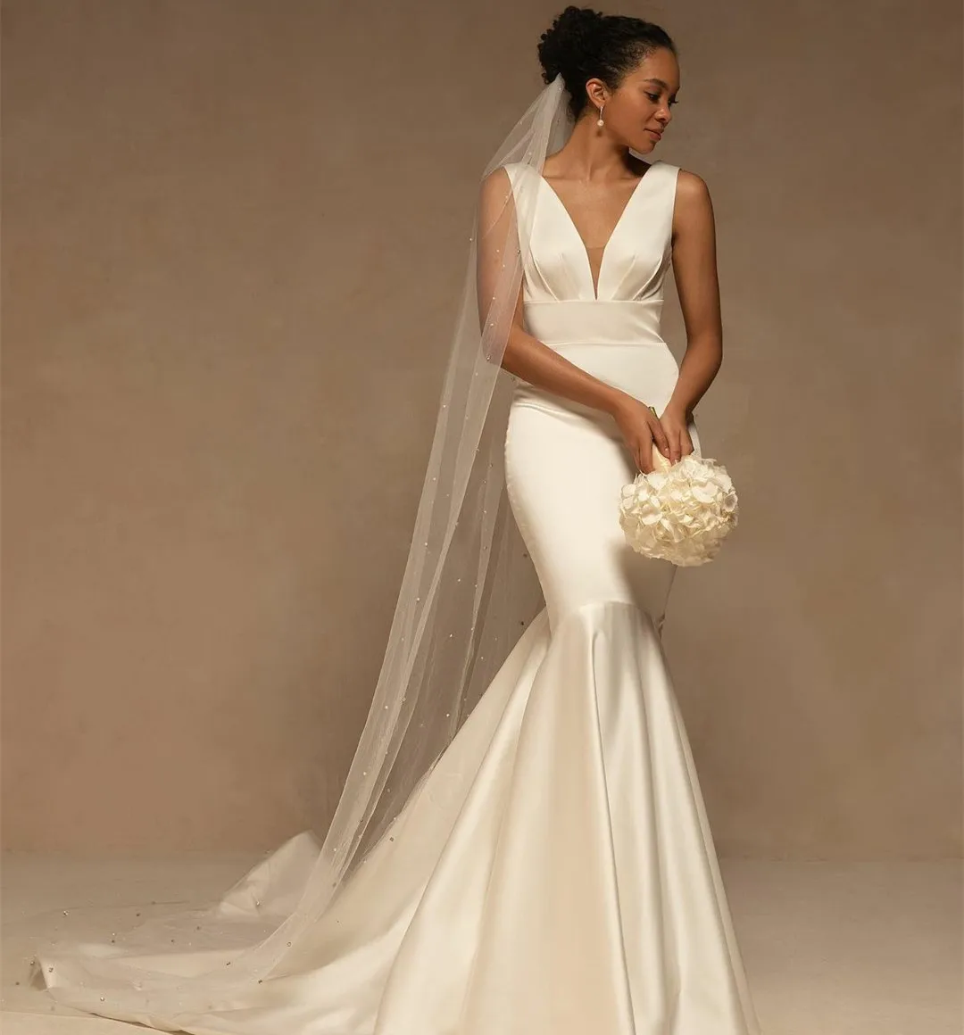 Believe It Vintage Long Pleated Satin Wedding Dresses Mermaid V-neck Wedding Gowns Sweep Train Custom Made Vestido De Novia For Women Now 80% Cheaper [ZI7654FC]