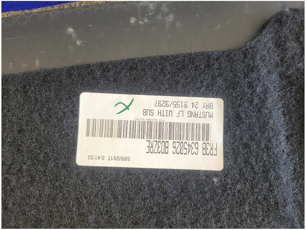 Rear Coupe Trunk Carpet Board that was removed from a California Special 2017 Ford Mustang GT Coupe with 49k miles. Assembly is still in good condition and ready to install. We do not warranty the color or the finish. Make sure you verify the part numbers. Please view all pictures before purchasing. This Ford Mustang GT Coupe had an automatic transmission with paint code J7 and axle code YY 3.15.