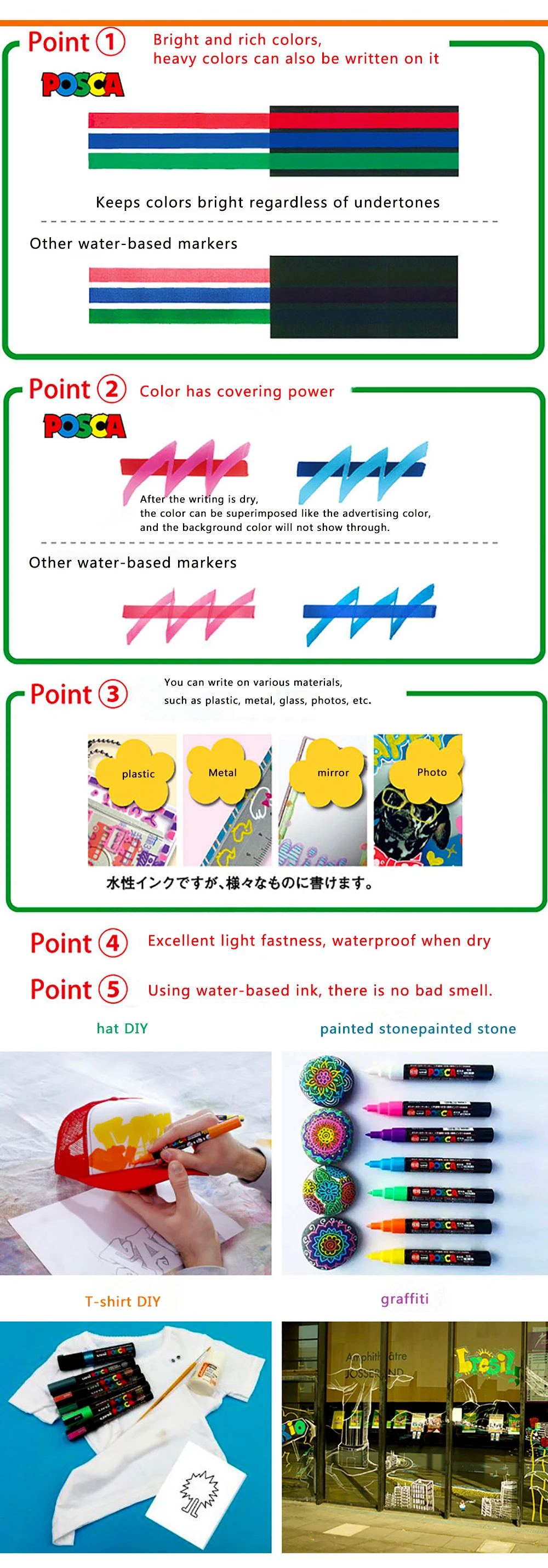 POSCA PC-1M,It uses special pigment inks, has water resistance, does not fade when exposed to water, and also has clear and vivid ink colors when written on glossy paper.