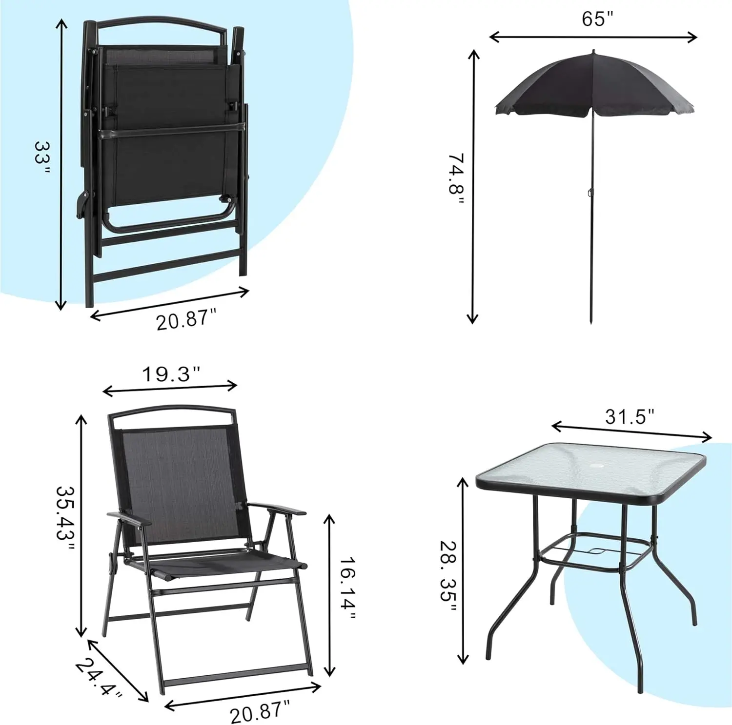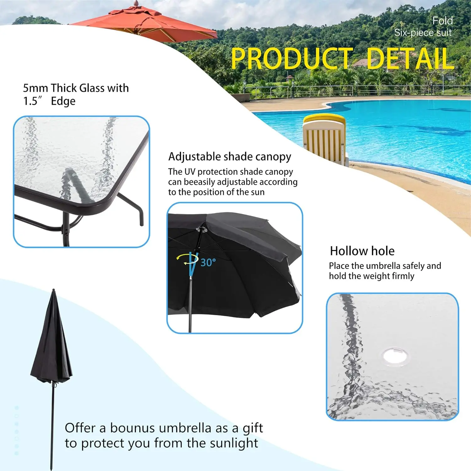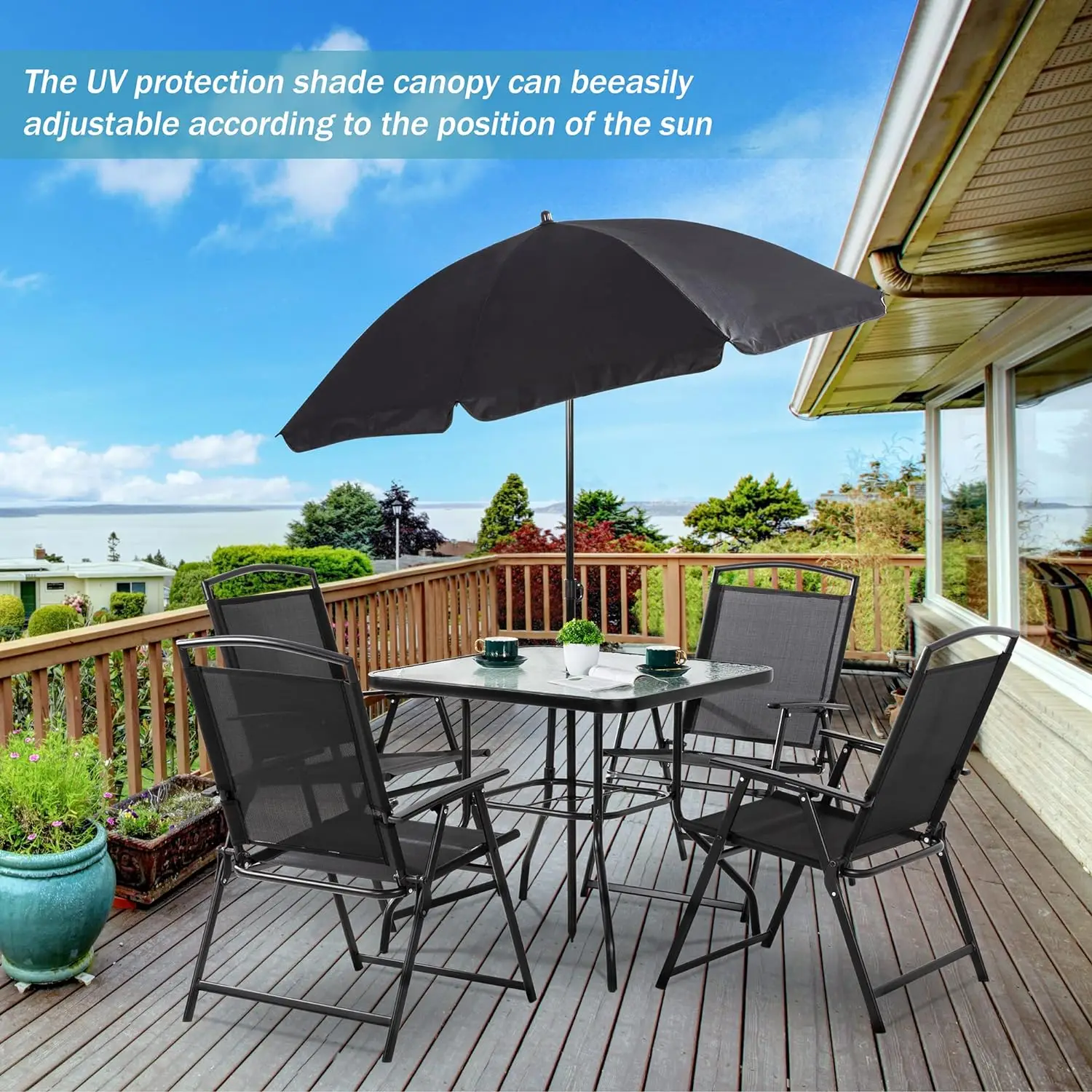 - 6 Piece Outdoor Table and Folding Chair Set with Umbrella: This patio garden set is the best selection for your outdoor life. Coming with a large patio umbrella add extra shade for your outdoor life. Perfect fit for your patio lawn and garden.