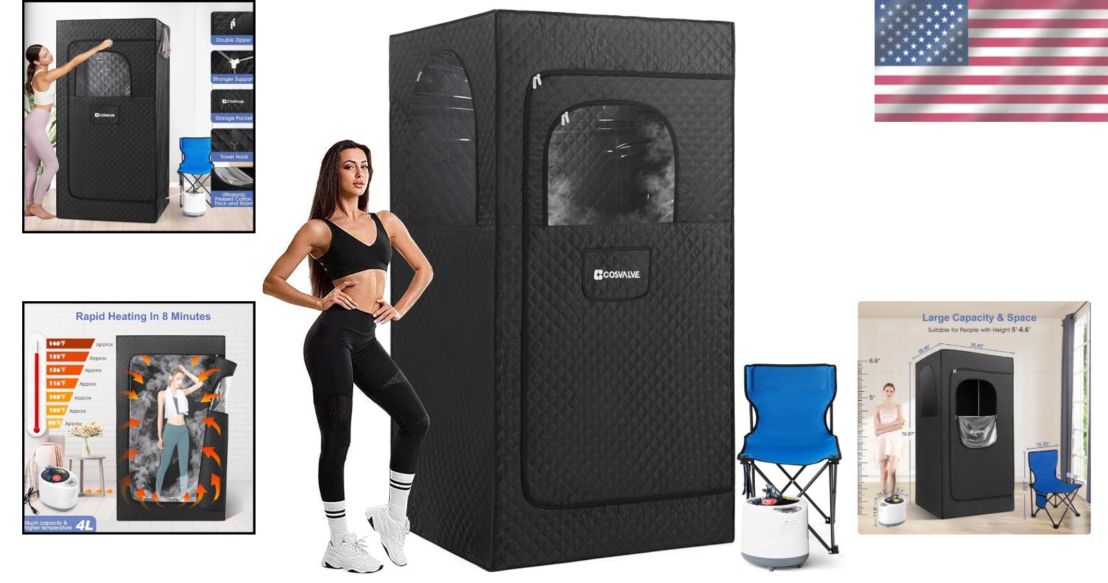 - Spacious sauna dimensions: 35.45" x 35.45" x 70.87" (L*W*H) - ideal for individuals between 5' and 6.6' tall.