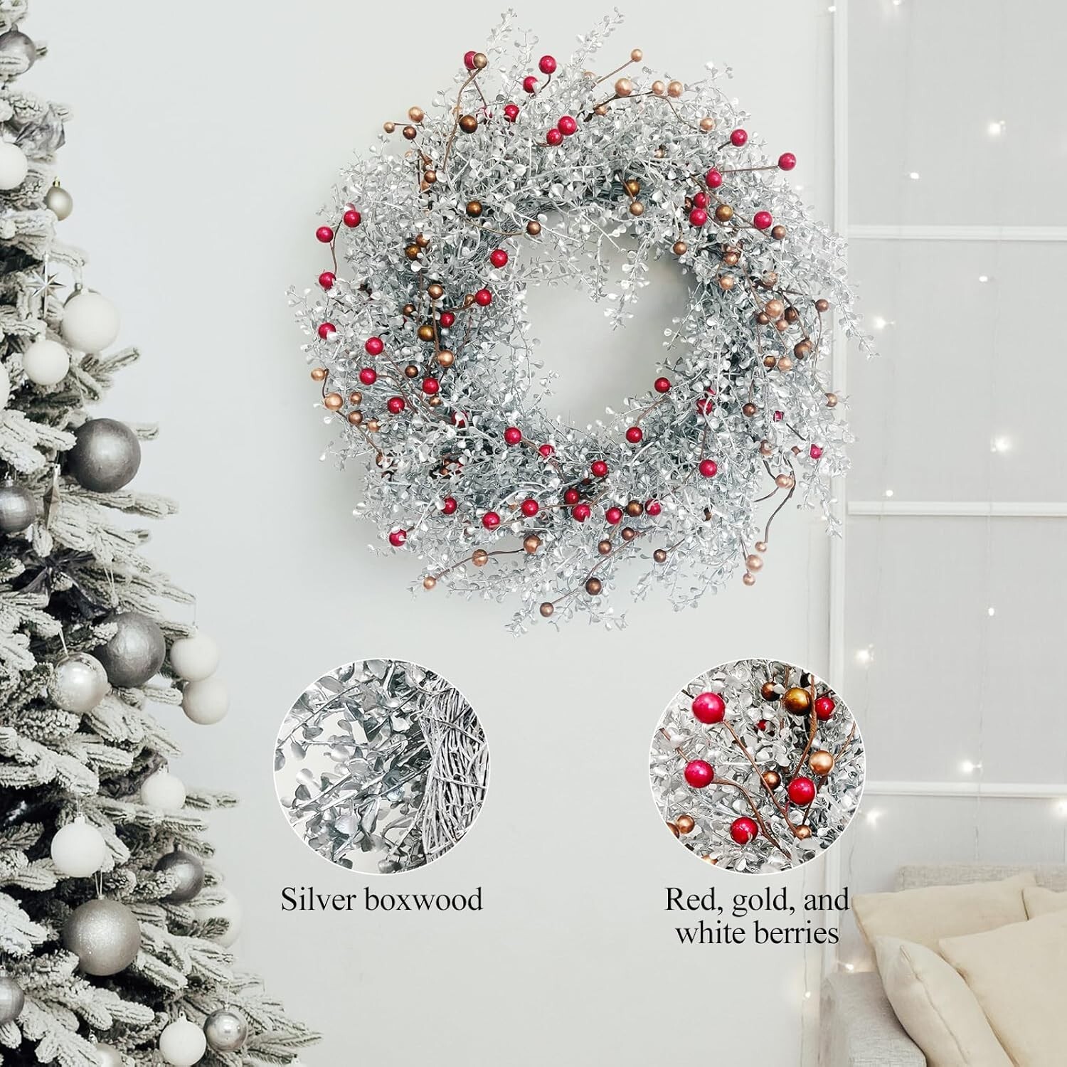 Experience the elegance and warmth of winter with our Adjustable 24-Inch Winter Wreath. Designed with meticulous care, this wreath introduces a delightful winter charm to your home or special event. The combination of metallic silver boxwood and vibrant berries creates a captivating piece that is sure to captivate your guests.