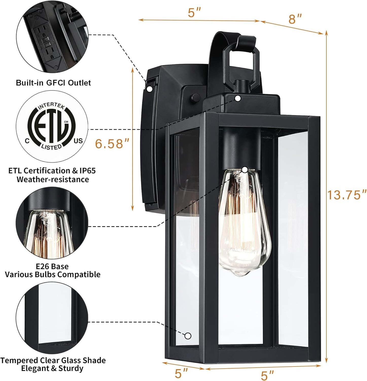 Elevate your outdoor experience with our stunning ETL Listed Outdoor Sconce, featuring a matte black design that combines elegance with functionality. With built-in GFCI outlets for seamless power access, weather-resistant materials, and compatibility with various bulb types, this fixture is your ultimate outdoor lighting solution. Embrace the harmony of practicality and style – order your Outdoor Sconce today!