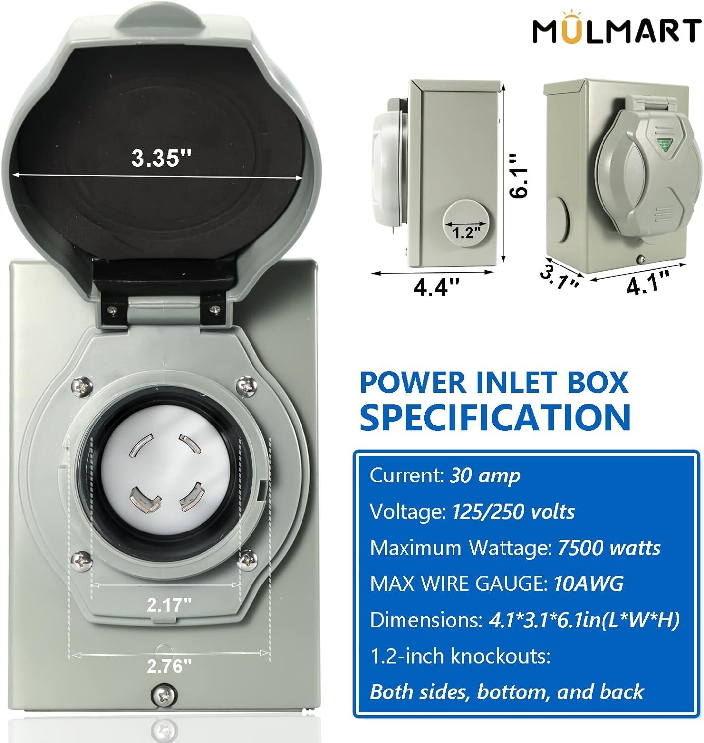 - Power Inlet Box: 30A Generator Cord Inlet Box PB30, rated for 125/250V and 7500W, expertly designed for outdoor installation, ensuring continuous backup power supply even during adverse weather conditions.