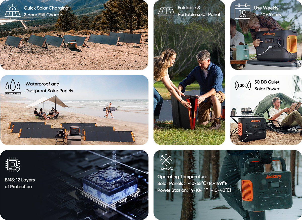 The Solar Generator 2000 Pro delivers a colossal charging capacity of 2,160Wh and can be fully charged with 6 SolarSaga 200W solar panels in only under 2.5 hours, and in just 2 hours via an AC wall outlet. Superior BMS guarantees safety and reliability.