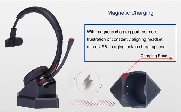- 【PLAYTIME AND RECHARGE】The Bluetooth headset with microphone can last a full work week for 40+ hours on a single charge. Rotate the microphone boom to just listen and flip it back down for a Teams call or video conference. With magnetic charging dock, no frustration Micro-USB charging jack of the headset to adapt to the charging station for a hassle-free charging.