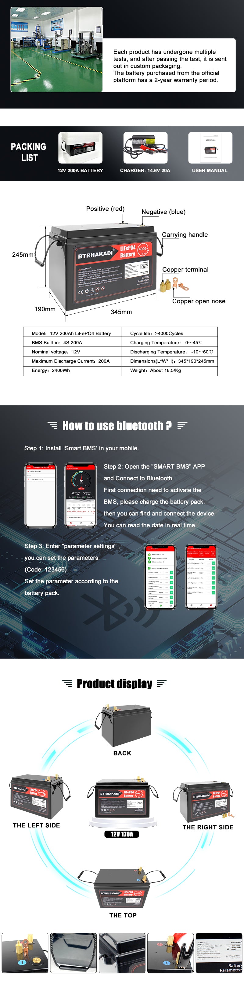 Battery SpecificationQSL-12V 200AhNominal voltage: 12.8V Standard capacity: 100AhSize: 333*176*217mmWeight: 10.35KgCharge voltage: 14.6VCut-off voltage: 11VStandard charging method: 0.2CMax. charge current: 0.5CMax Continuous discharge current: 100AO