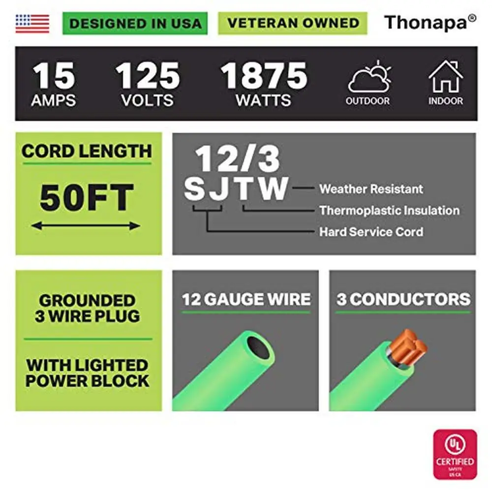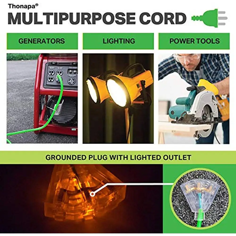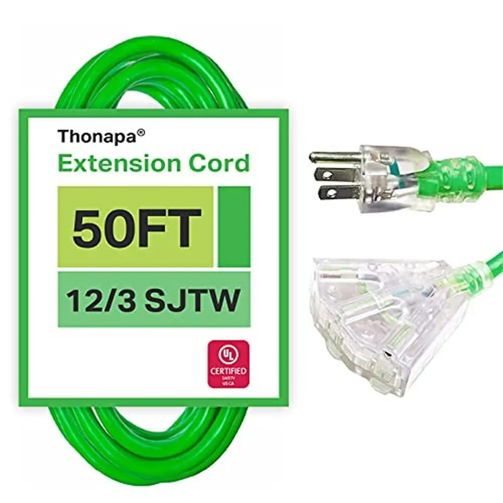 Lightweight Outdoor Extension Cord 50ft Heavy Duty 3 Outlet Power Cable Neon Green Led Lighted Plug Ul Listed 12/3 Sjtw Slip Resistant Now 35% Cheaper [XzO4ZbQh]