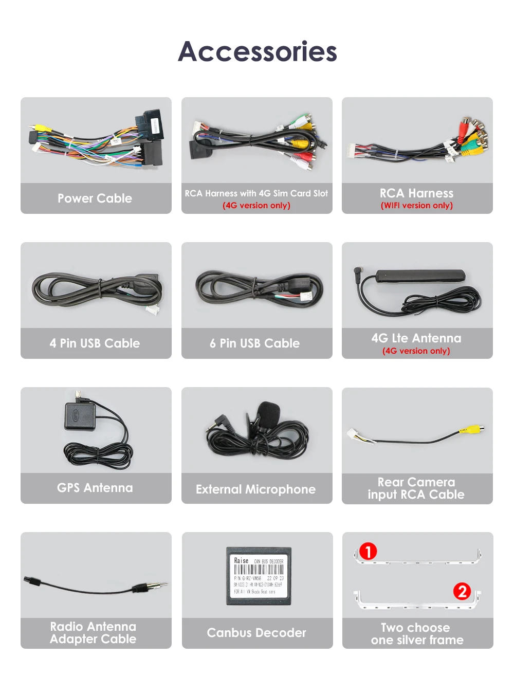 2) ADAS DVR Camera, Tire Pressure Monitoring, OBD2, External Microphone, RCA cable; 3) If the Car Original Wire connectors is special(not the same as our accessories Pin) which needs to order separately adapter for install.