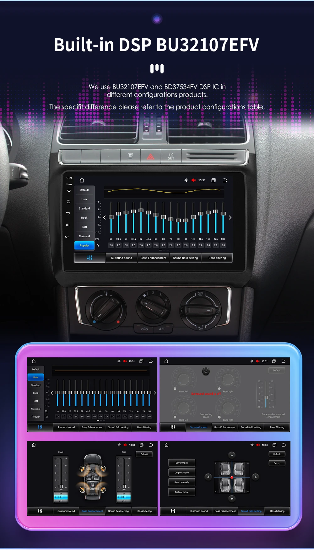 Built-in DSP BU32107EFV: We use BU32107EFV and BD37534FV DSP IC in different configurations products. The specifit difference please refer to the product configurations table.