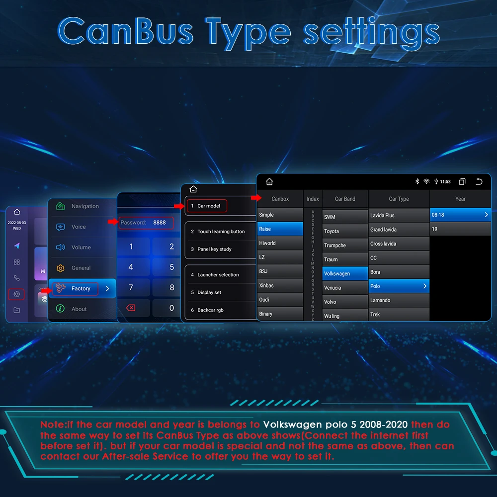 Canbus Type settings: (Type B) Factory--8888--Car model--Raise--Volkswagen--Polo--08-18--ok.