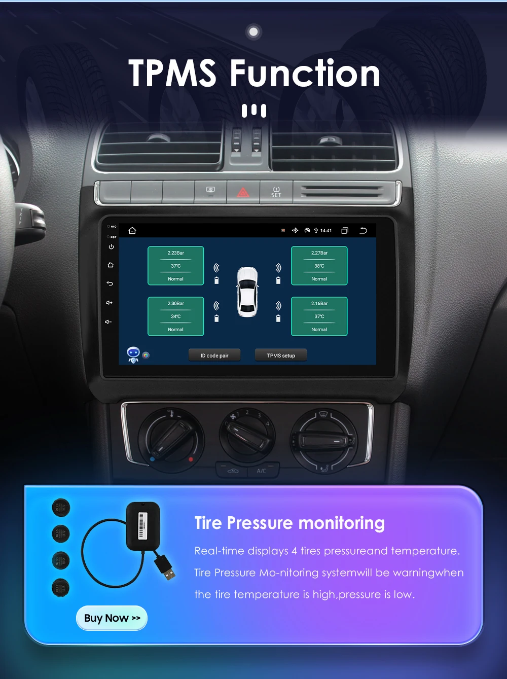 TPMS Function( Needs to order separately) : Tire Pressure Monitoring: Real-time displays 4 tires pressure and temperature,Tire Pressure Monitoring system will be warning when the tire temperature is high, pressure is low.