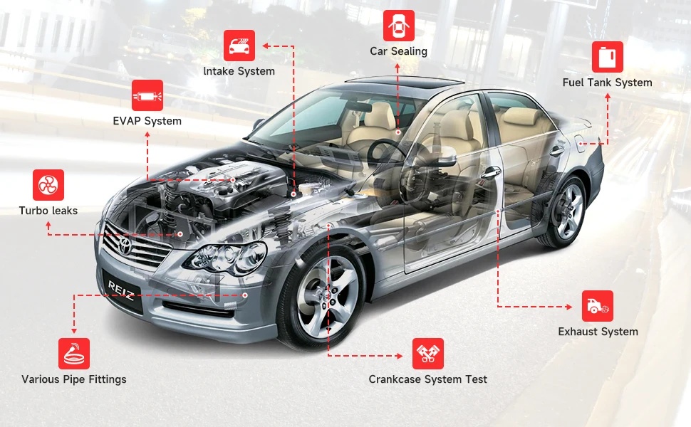 1/2psi pressure gauge and smoke regulator which helps you control the smoke effect easily and allowing you to estimate the size of the leak by the change of the gauge value.It will specifically mark where the leakage is coming from,improves the efficiency of diagnosis